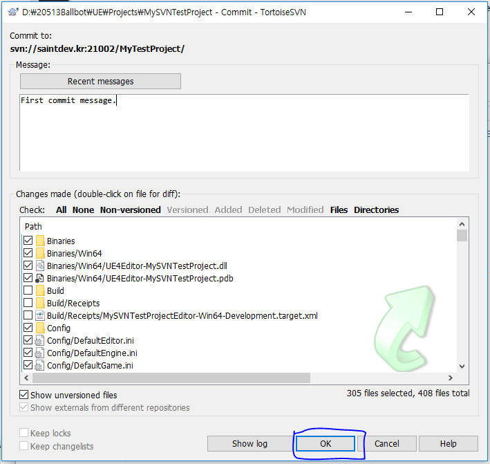 커밋 메세지를 적고, OK 를 누르면 서버로 프로젝트가 업로드 된다.