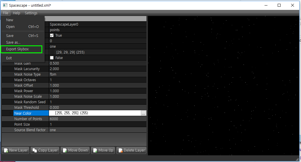 File -> Export Skybox 를 클릭하여 스카이박스를 익스포트 하자.