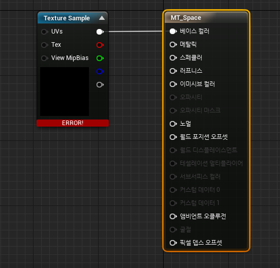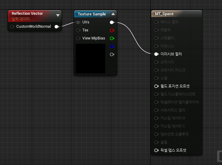 마지막으로 텍스처 샘플의 출력 노드를 이미시브 컬러로 바꾼다.