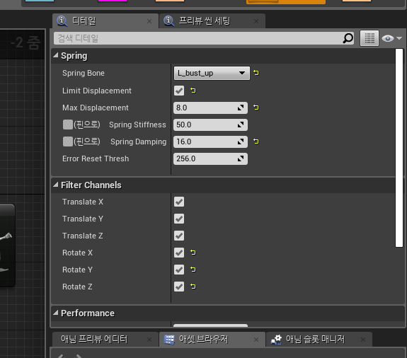 애니메이션 블루프린트로 돌아와, 스프링 컨트롤러에 Limit Displacement 옵션을 활성화 한다.