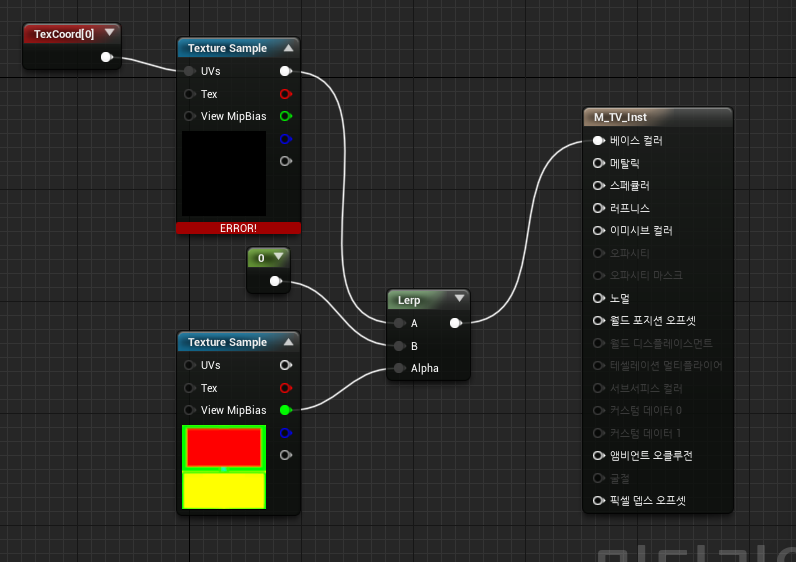 텍스처 샘플을 두개 생성하고, 아래 것은 T_TV_M2 텍스처를 적용하도록 한다.