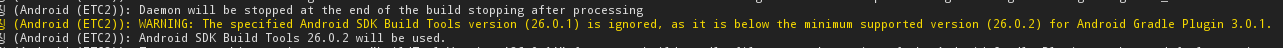 The specified Android SDK Build Tools version (26.0.1) is ignored, as it is below the minimum supported version (26.0.2) for Android Gradle Plugin 3.0.1.