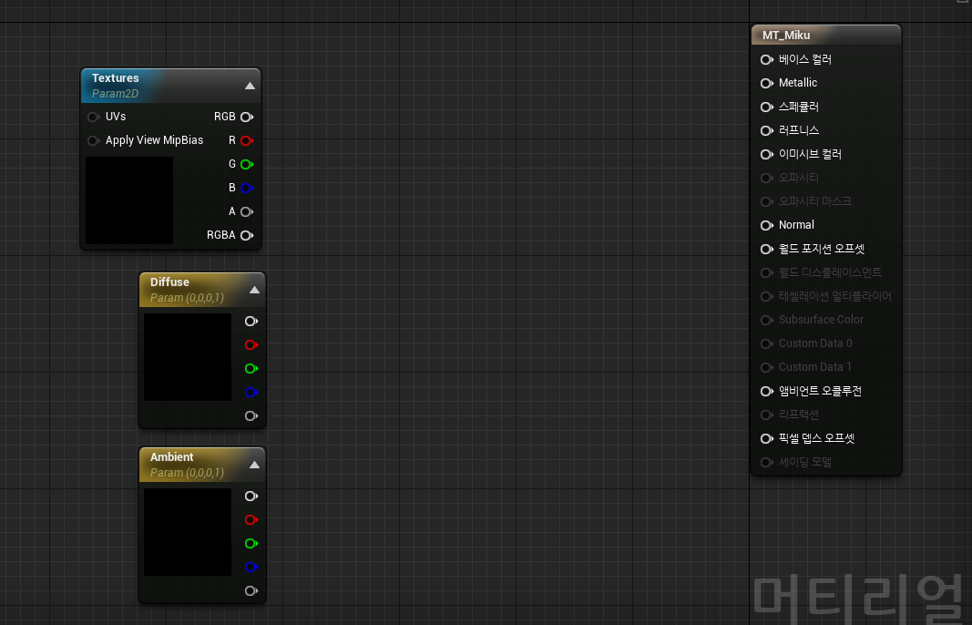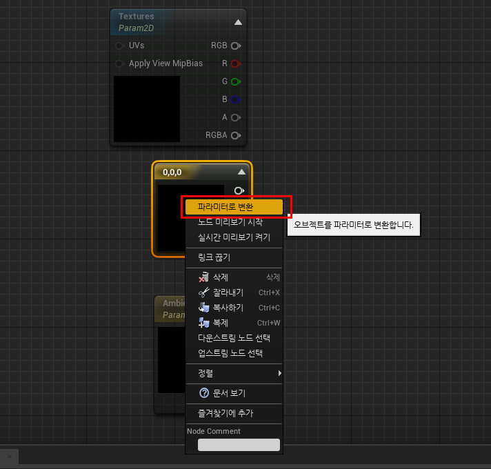생성한 3개의 노드를 파라미터로 변환하고, 이름을 각각 Texture, Diffuse, Ambient 로 설정 한다.