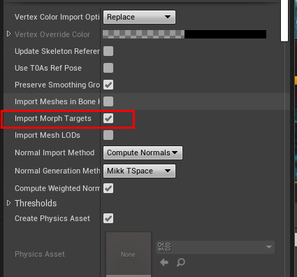 Import Morgh Targets | 체크 | https://docs.unrealengine.com/ko/Engine/Content/FBX/MorphTargets/index.html