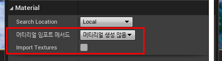 머티리얼 임포트 메서드 | 생성 하지 않음 | 머티리얼은 만들어봐야 비어있으므로 의미가 없다. |