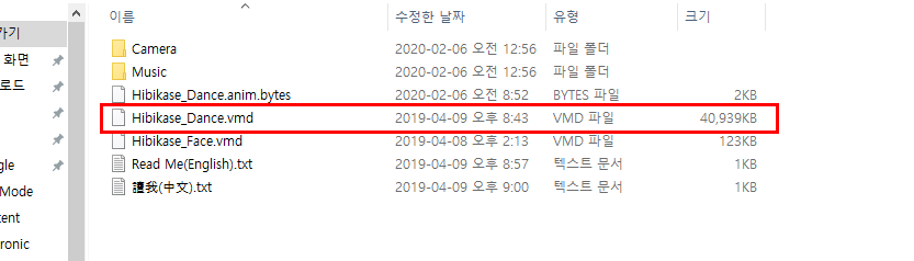 압축을 풀어둔다. .pmx 파일과 텍스쳐 파일이 있는지 확인 하고, 다음은 모션 데이터를 다운로드 하도록 하자.