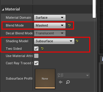 머티리얼 설정으로 이동하여, 아래 표와같이 설정을 마친다.