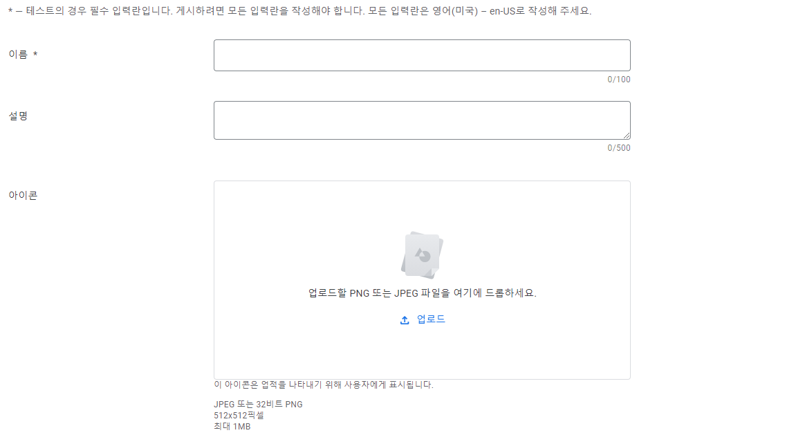 이름, 설명, 아이콘을 업로드 해야한다.