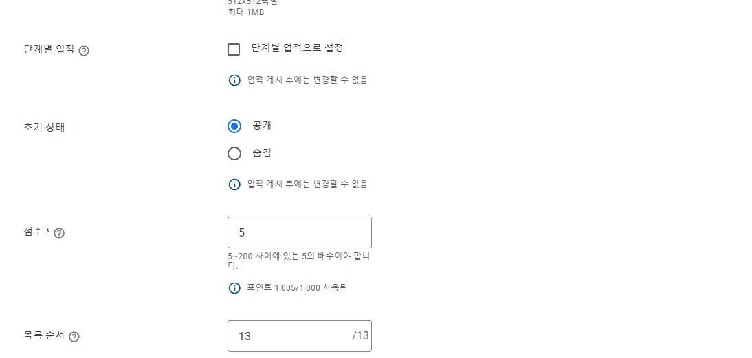 | 포인트 | 한 게임에서 1,000점의 포인트를 제공 할 수 있다. 업적의 난이도를 고려해서 잘 배분하자. |