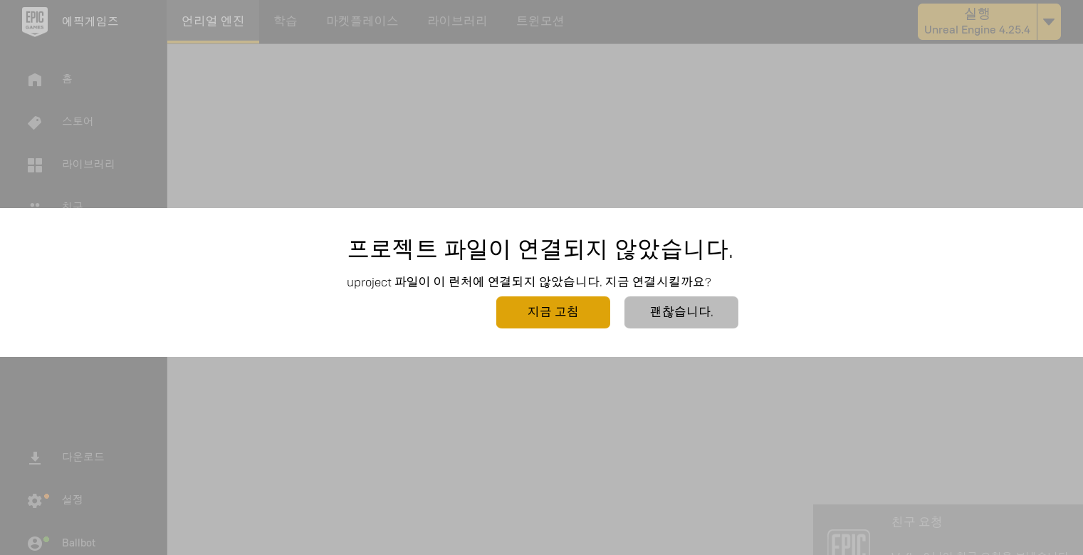 이런 경우에, 대게 EpicGamesLauncher 를 다시 시작해주면 아래와 같은 다이얼로그가 뜨면서