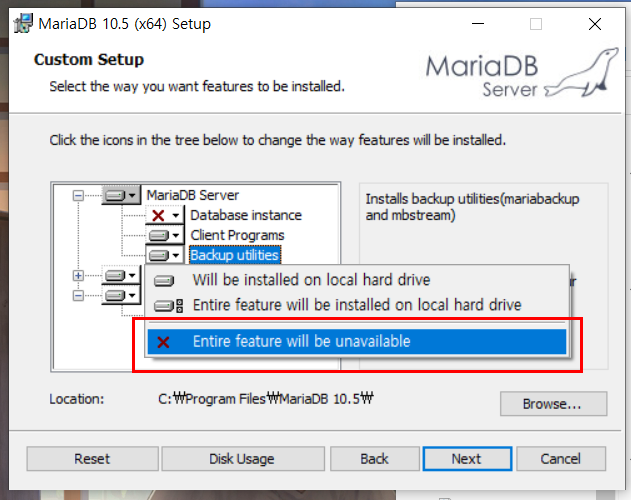 Client Programs 말고 나머지는 모두 설치 하지 않도록 한다.