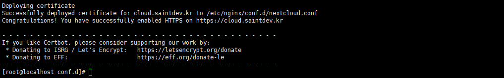 즉, nginx 에서는 cloud.saintdev.kr 라는 도메인이 하나 등록되어 있다고 보면 된다.
